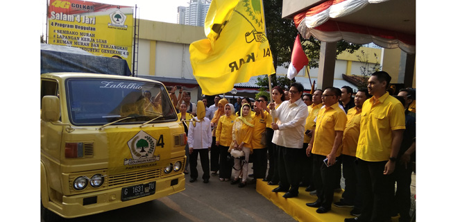 Pelepasan bantuan dilakukan langsung Ketum Golkar Airlangga Hartarto di Kantor DPP Golkar, Slipi, Jakarta, Senin (13/8).