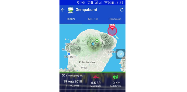 BMKG melaporkan gempa susulan di Lombok dirasakan terjadi 2 kali yaitu 5,4 SR dan 6,5 SR.