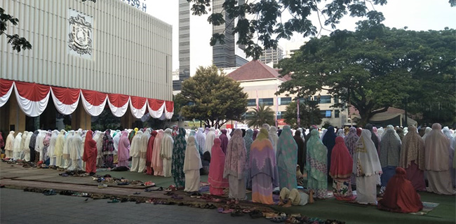 Ratusan orang yang berkumpul untuk melaksanakan Salat Id sangat khusyuk dalam menunaikan ibadah. Halaman Balai Kota pun tampak penuh.