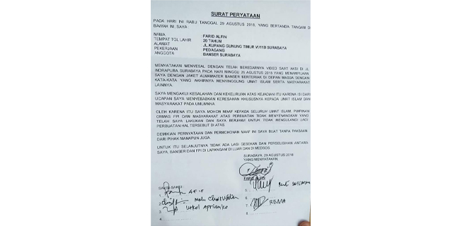 Informasi yang diperoleh agenda mediasi yang digelar Polrestabes Surabaya itu yakni mencari solusi atas persoalan pernyataan salah satu oknum Banser bernama Farid, yang diduga melakukan tindak intimidasi kepada massa #2019GantiPresiden.