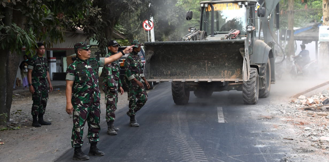 Panglima Kogasgabpad Mayjen TNI Madsuni meninjau pembersihan puing-puing rumah penduduk yang dilakukan oleh prajurit TNI di Desa Medana, Kecamatan Tanjung, Kabupaten Lombok Utara, Jumat (31/8).