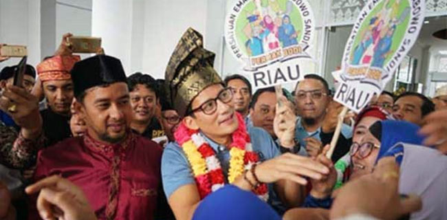 Kantor Berita RMOLRiau, Selasa (4/9), Sandi mendarat di Bandara Internasional Sultan Syarif Kasim II Pekanbaru sekitar pukul 8.30 WIB. Sejak pagi, pendukungnya, telah menunggu dengan antusias.