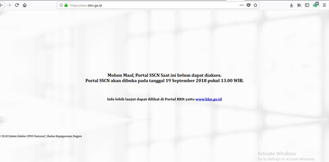 "Portal SSCN saat ini belum dapat diakses sampai pengumuman resmi dari Pemerintah terkait penerimaan CPNS 2018. Info lebih lanjut dapat dilihat di Portal BKN yaitu