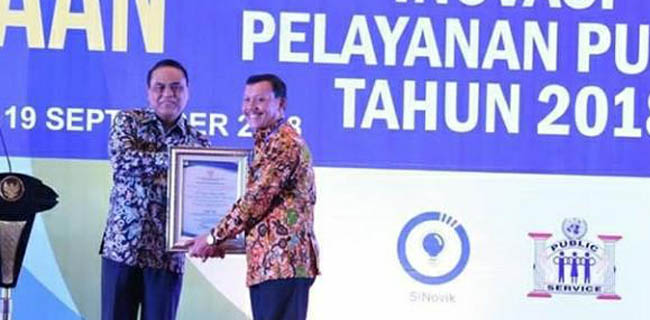 Sekretaris Daerah Jawa Barat, Iwa Karniwa menerima langsung penghargaan dari Menteri Pendayagunaan Aparatur Negara dan Reformasi Birokrasi (PANRB), Syafruddin dalam acara Pemberian Penghargaan TOP 99 Inovasi Pelayanan Publik 2018 di Surabaya.