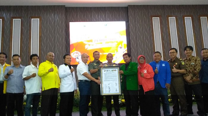 Semua yang hadir membacakan ikrar untuk menyepakati bersama penyelenggaraan Pemilu 2019 Kota Surabaya.