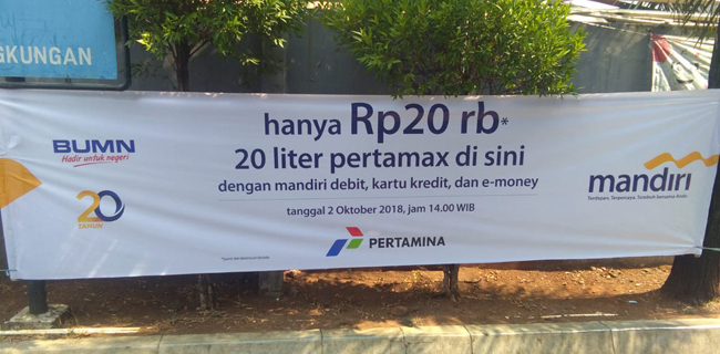 Salah satunya antara lain promo pembelian 20 liter Pertamax di SPBU Pertamina seharga Rp 20.000 dengan menggunakan Mandiri Kartu Kredit, Debit dan e-money.