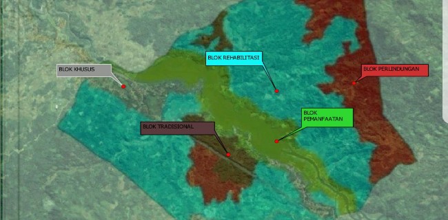Adapun keenam blok pengelolaan tersebut adalah blok perlindungan seluas 559,50 Hektare (Ha), blok pemanfaatan 325,30 Ha, blok tradisional 100,76 Ha, blok khusus seluas 254,31 Ha, blok religi seluas 0,57 Ha, dan blok rehabilitasi seluas 1484,12 Ha.