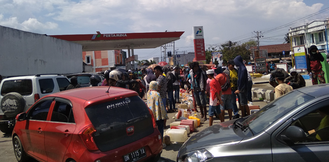 Antrean warga mengular hingga satu kilometer di salah satu stasiun pengisian bahan bakar umum (SPBU) di Kecamatan Palu Barat, Kota Palu, Sulawesi Tengah, Rabu (3/10).