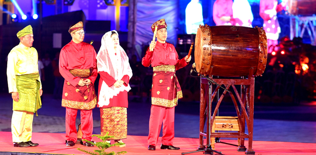 Presiden Joko Widodo didampingi Menko PMK Puan Maharani, Menteri Agama Lukman Hakim Saifuddin, dan Gubernur Sumatera Utara, Edy Rahmayadi memukul bedug tanda dimulainya Musabaqah Tilawatil Quran (MTQ) Nasional XXVII tahun 2018, yang digelar di Gedung Serba Guna, Jl. Wiliam Iskandar, Kota Medan, Sumatra Utara, Minggu malam (7/10). Dilansir dari laman Setkab, Kepala Negara hadir bersama Ibu Negara Iriana Joko Widodo ke lokasi. Repro