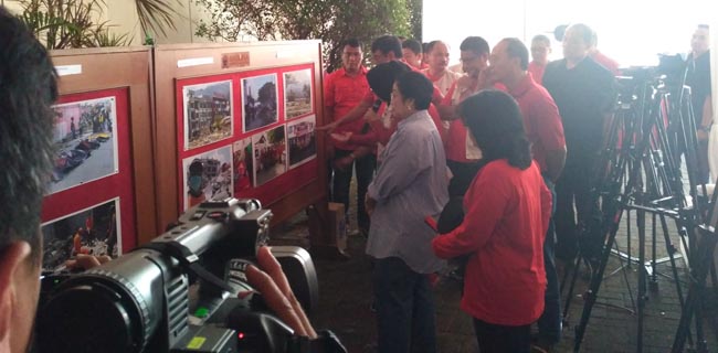 Mega nampak serius melihat satu persatu foto korban dan kegiatan penyerahan tahap satu bantuan Baguna PDIP yang dipajang.