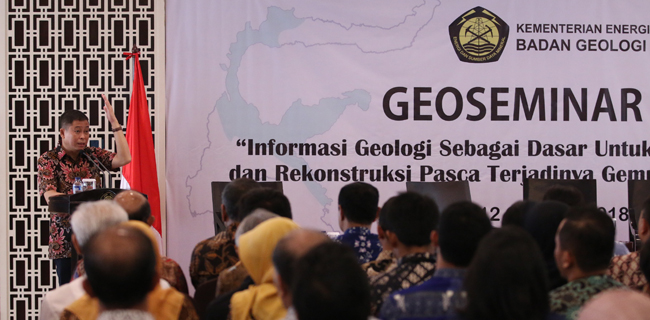 Menteri ESDM, Ignasius Jonan membuka Geoseminar dengan tema "lnformasi Geologi Sebagai Dasar Untuk Rehabilitasi dan Rekonstruksi Pasca terjadinya Gempabumi Palu" di Jakarta, Jumat (12/10). Seminar tersebut bertujuan untuk menyampaikan data terbaru tentang kondisi Palu dan sekitarnya dari aspek geologi dan menyampaikan kepada peserta seminar bahwa daerah Palu secara geologi masih dapat dibangun kembali, namun dengan memenuhi beberapa persyaratan. Patrarizki Syahputra/RM