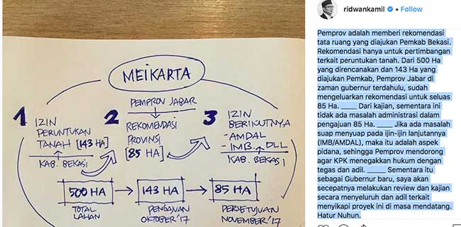 “Jadi rekomendasi (Pemprov Jabar) hanya untuk pertimbangan terkait peruntukan tanah,†tutur mantan walikota Bandung itu dalam akun Instagram