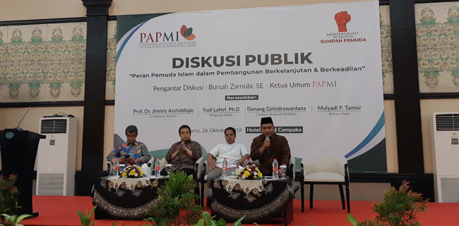 Demikian dikatakan pengamat politik, Yudi Latief dalam diskusi Perkumpulan Alumni Organisasi Pelajar, Pemuda, Mahasiswa Islam (PAPMI) memperingati 90 tahun Sumpah Pemuda dengan tema "Peran Pemuda Islam dalam Membangun Berkelanjutan dan Berkeadilan" di Hotel Grand Cempaka, Jakarta, Jumat (26/10).