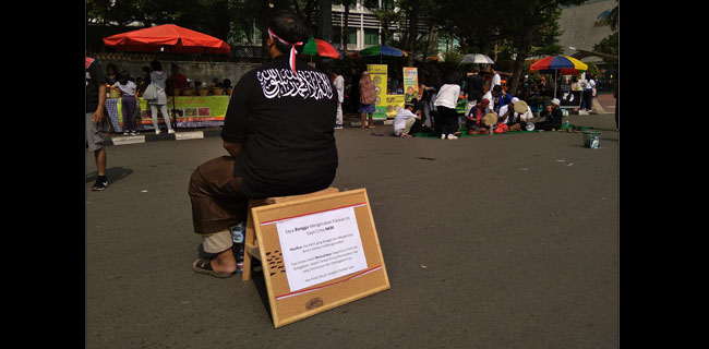 Aksi yang dilakukan seorang pria bernama Rahman ini pun menyita perhatian masyarakat. Dia menyertakan tulisan pada sebuah karton.