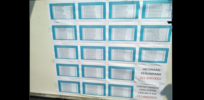 Berikut manifest penumpang Lion Air yang tertera di posko crisis center di Bandara Soekarno-Hatta, Cengkareng, siang ini: