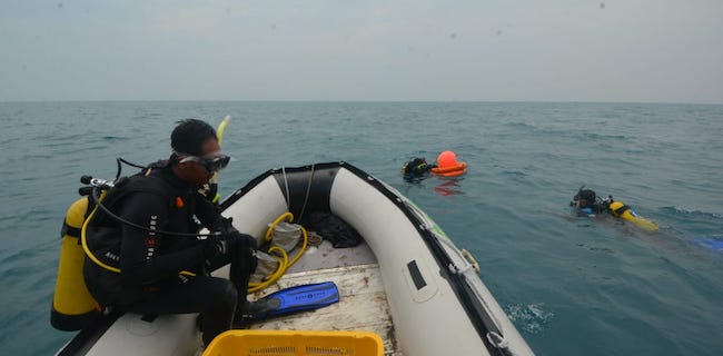 Dengan menggunakan perahu karet, penyelam menuju lokasi yang diduga menjadi tempat jatuh pesawat dengan rute penerbangan Jakarta menuju Pangkalpinang tersebut.