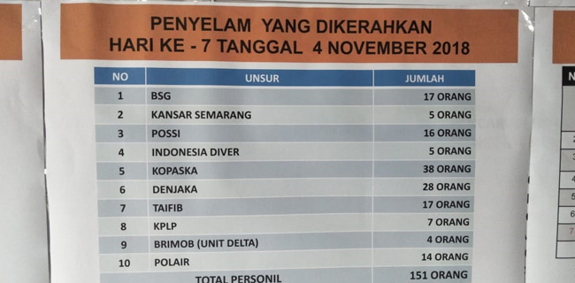Kemudian POSSI 16 orang, Indonesia Diver 5 orang, Kopaska 38 orang, Denjaka 28 orang, Taifib 17 orang, KPLP 7 orang, Brimob (Unit Delta) 4 orang, dan Polair 14 orang.