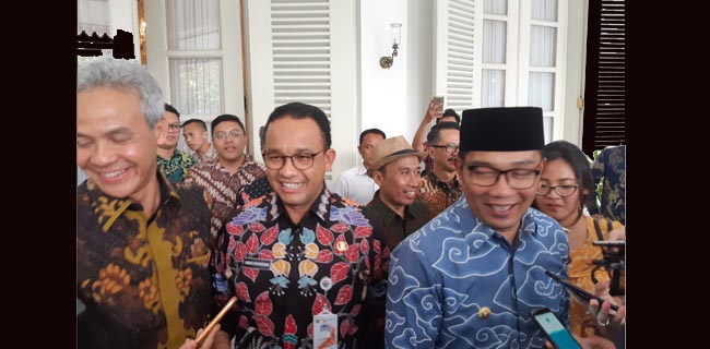Anies mengenakan batik hitam lengan panjang bermotif kembang merah, biru dan kuning. Begitu pun Kang Emil dan Ganjar yang juga mengenakan batik.