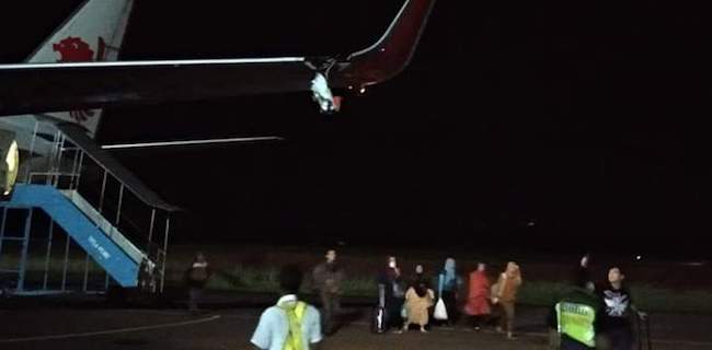 Sayap pesawat dengan nomor penerbangan JT 633 itu mengalami kerusakan di bagian sayap kiri akibat berbenturan dengan tiang.