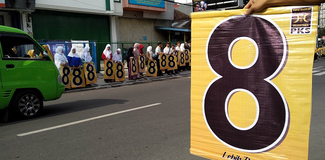 Mereka berjejer rapih sejauh dua kilometer sembari memegang poster bertuliskan angka 8, nomor urut PKS sebagai partai politik peserta Pemilu 2018.
