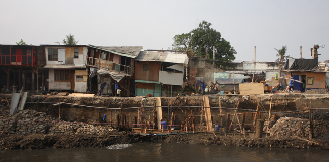 Petugas dari Dinas Tata Air DKI Jakarta melakukan perbaikan dinding turap Kali Ciliwung yang longsor di Kelurahan Ancol, Pademangan, Jakarta Utara, Selasa (20/11). Sebanyak tiga rumah ambles dan rusak akibat longsor dinding turap Kali Ciliwung. Tidak ada korban jiwa dalam longsor tersebut dan saat dalam perbaikan oleh Pemprov DKI. Putu Wahyu Rama/RM