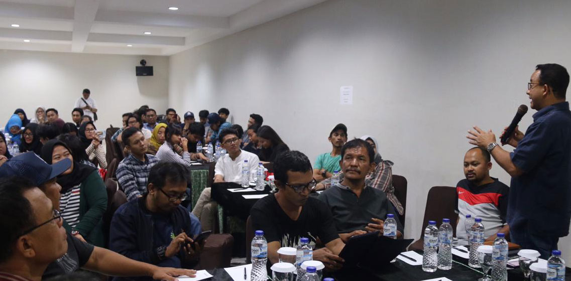 "Jangan sebut saya Pak Gubernur untuk saat ini, saya ini sedang duduk bersama-sama kalian dan tentunya membicarakan hal-hal Jakarta. Saat ini saya bukan Pak Gubernur, tapi saya sebagai Anies Baswedan," ujar Anies.