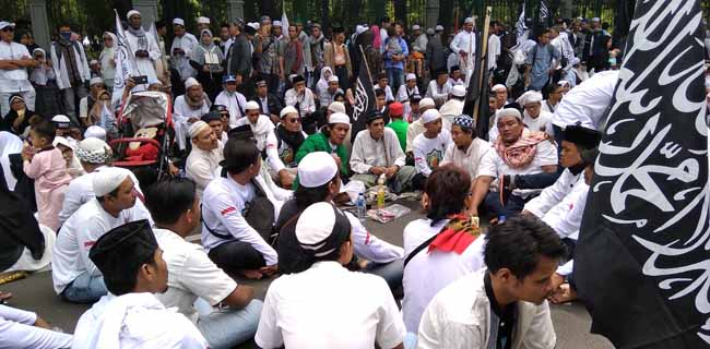 Sekelompok peserta Reuni Akbar Mujahid 212 menggelar tahlilan di ruas Jalan Medan Merdeka Barat, Menteng, Jakarta, Minggu (2/12). Mereka tak bisa mencapai Lapangan Silang Monumen Nasional (Monas), karena padatnya massa Reuni 212. Ahmad Kiflan Wakik/RMOL