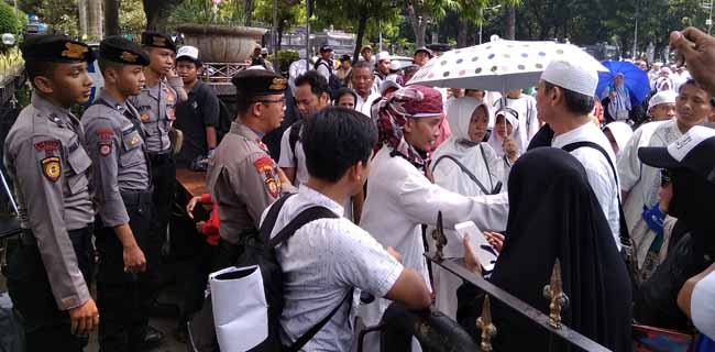 "Kami hanya melaksanakan perintah, sesuai SOP bahwa jalur ini ada sterilisasi," ujar salah satu petugas kepada peserta Reuni 212 yang protes.
