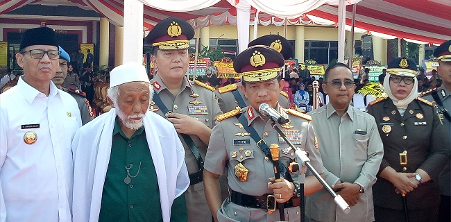 RMOL Banten, Kapolri Jenderal Tito Karnavian datang menggunakan helikopter dan tiba di Mapolda Banten sekitar pukul 09.00 WIB. Kedatangan orang nomor satu Polri itu disambut Kapolda Banten Brigjen Pol Tomsi Tohir dan jajarannya.