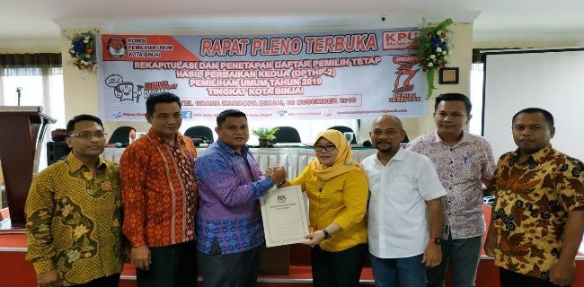 Ketua KPU Kota Binjai, Zulfan Effendi mengatakan sesuai dengan hasil rapat pleno jumlah pemilih di Kota Binjai tercatat sebanyak 190.945 orang dengan rincian pemilih laki-laki berjumlah 92.909 dan pemilih perempuan berjumlah 98.036 yang tersebar di 5 kecamatan, 37 kelurahan, dan 713 TPS untuk wilayah Kota Binjai.