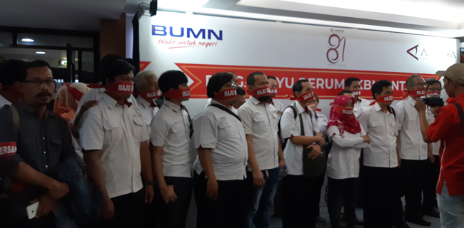 Dengan menggunakan seragam kantor Antara, para pendemo pun menutupi mulut mereka dengan kain bertuliskan 'Maju Bersama' dan berjalan menuju auditorium Adhyana.