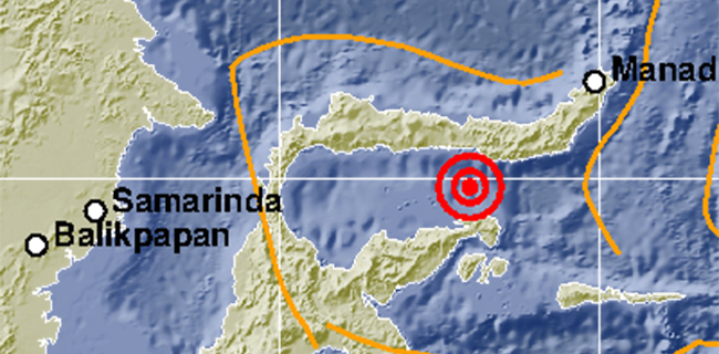 Titik gempa berada di 74 km arah barat daya Gorontalo, dengan titik koordinat 0.12 derajat Lintang Selatan dan 122.98 derajat Bujur Timur.