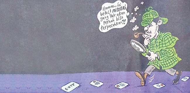 Tangan kanannya memegang cangklong rokok. Tangan kirinya memegang kaca pembesar sambil mengucapkan pernyataan yang penuh keanehan. "Hmmm.. Ini betul-betul penuh misteri yang tak akan pernah bisa terpecahkan??" sambil mengikuti ceceran e-KTP yang berada di depanÂnya.