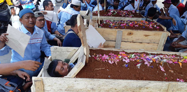 Tiga replika kuburan lengkap dengan papan nama, tanah, dan taburan bunga di atasnya digunakan untuk mengubur para sopir truk yang belum dibayar upahnya sejak lima bulan itu.
