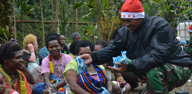 Seperti dalam keterangan yang diterima redaksi sesaat lalu, TNI dan masyarakat bercengkrama sambil menyantap pinang ciri khas makanan Papua, anak-anak kegirangan mendapatkan permen dan bingkisan Natal dari tangan prajurit TNI yang menggunakan topi Santa Claus.