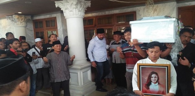Dylan yang menjadi korban tsunami di Pantai Tanjung Lesung, Banten, langsung disalati. Tampak sang suami, Ifan turut menurunkan peti mati berisi jasad istrinya.