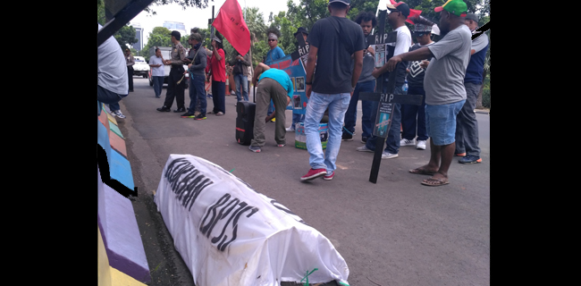 Pantauan di lokasi aksi, puluhan pekerja datang dengan berbagai atribut aksi. Di antara poster dan spanduk bertuliskan penderitaan mereka. Ada juga sebuah keranda bertutupkan kain kafan dengan tulisan "korban BPJS".