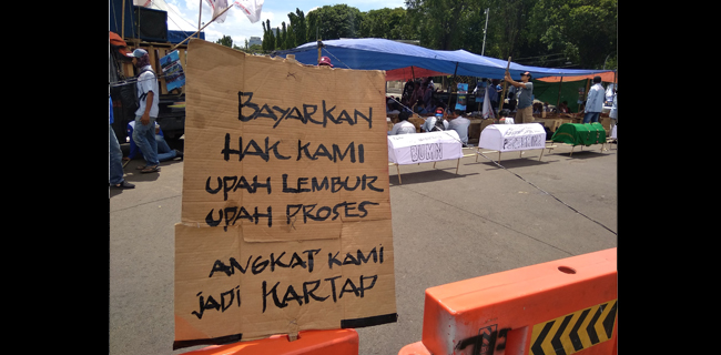 Aksi SP-AMT menyuarakan empat tuntutan: Pertama, bayarkan upah lembur yang belum dibayarkan sesuai nota Sudinaker dan Kementerian Ketenagakerjaan dan upah proses selama di-PHK. Kedua, pekerjakan kembali 1.095 AMT yang di-PHK massal dan secara sepihak.