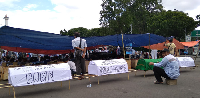 Sebagai simbol matinya keadilan yang mereka rasakan, empat buah keranda yang salah satunya bertuliskan turunkan Menteri BUMN, Rini Soemarno berbaris rapi.