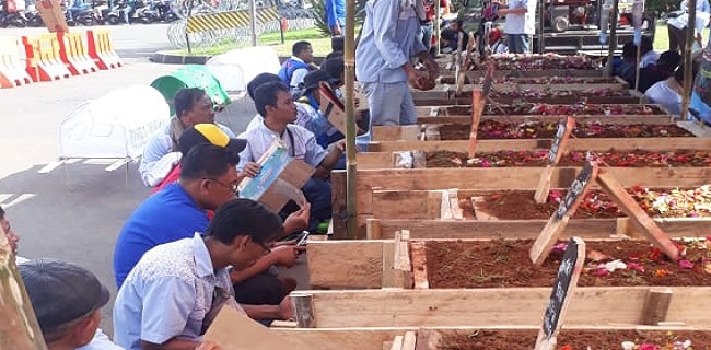 Sekitar empat belas sopir tangki ini mengubur diri, hampir seluruh badannya terkubur gundukan tanah dan hanya menyisakan kepala. Pun ada nisan kayu dan bunga yang biasa buat di pemakaman.