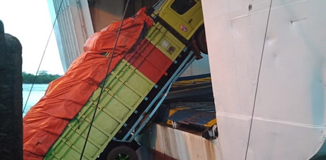 Kantor Berita RMOLLampung, truk berwarna hijau dengan nomor polisi B 9052 FN itu nyemplung saat akan masuk ke kapal Nusa Putera.