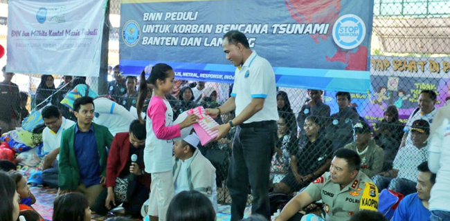 . Rombongan Badan Narkotika Nasional (BNN) hari ini Jumat (4/1) mendatangi korban tsunami di Kecamatan Labuan, Kabupaten Pandeglang, Banten, untuk menyampaikan bantuan yang dapat digunakan oleh para korban tsunami.