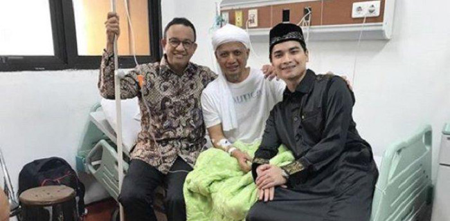 Arifin Ilham yang masih kenakan selang infus tersebut tampak senyum ketika bersebelahan dengan Anies.