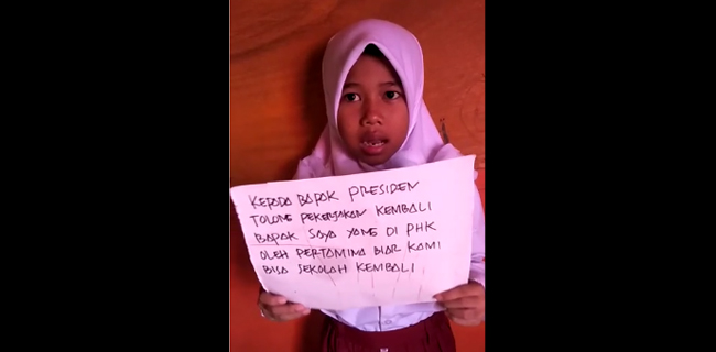 Dalam video tersebut, anak kecil ini meminta kepada Presiden Joko Widodo untuk kembali mempekerjakan orang tuanya yang di-PHK.