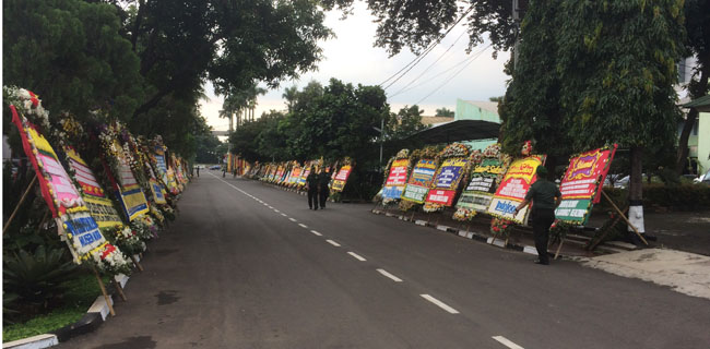Ratusan karangan bunga berjajar rapi di sepanjang jalan Lapangan Kodam Jaya, Kamis (31/1).