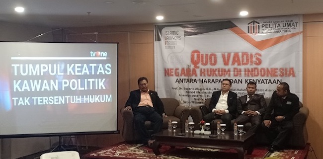 Begitu tegas Ketua LBH Pelita Umat Ahmad Khozinuddin dalam diskusi yang digelar Islamic Lawyer Forum bertajuk “Quo Vadis Negara Hukum Indonesia: Antara Harapan dan Kenyataan†di Hotel Namira Syariah Surabaya, Minggu (10/2).