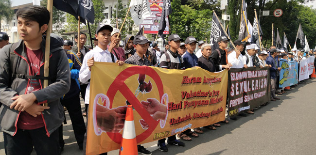 Ratusan orang yang tergabung dalam Masyarakat Jawa Barat Peduli Negeri menggelar unjuk rasa di depan Gedung Sate, Jalan Diponegoro, Bandung, Rabu (13/2). Mereka menolak budaya Valentine Day yang masih dirayakan sebagian warga pada setiap tanggal 14 Februari.