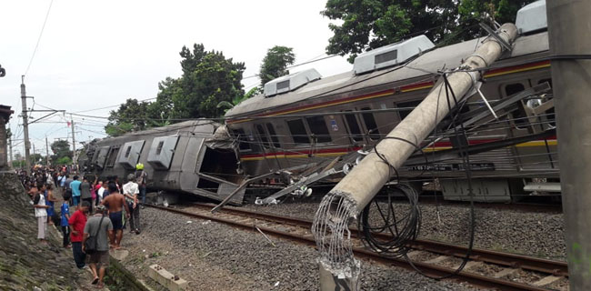 KRL tersebut anjlok hingga menimpa tiang listrik yang berada di dekat pintu perlintasan Kebon Pedes, Bogor.