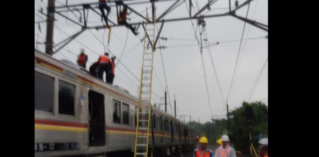 Petugas kepolisian sudah memasang police line di sekeliling area anjloknya KRL.
