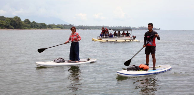 Menteri Kelautan Susi Pudjiastuti mengajak masyarakat melakukan olahraga paddleboarding. Susi mengayuh